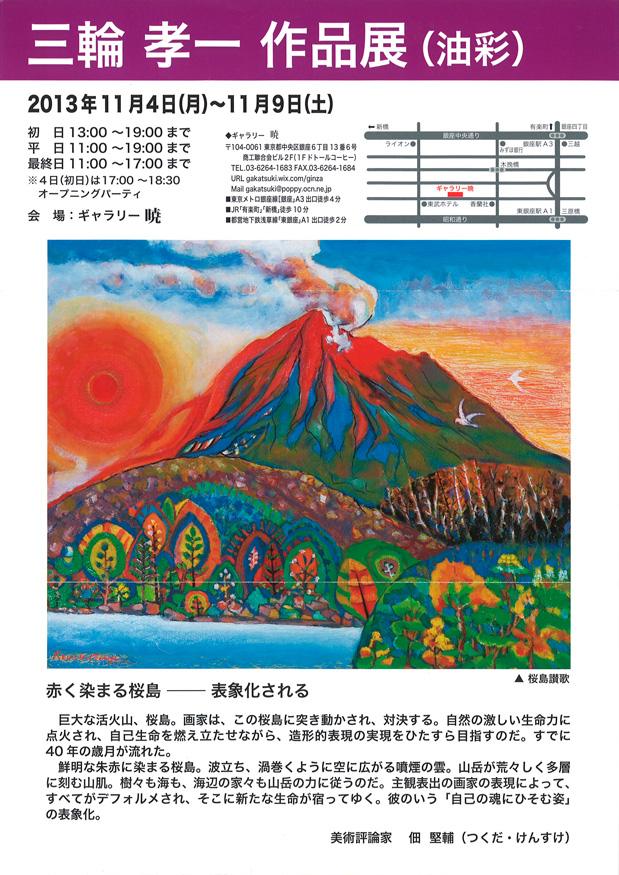 三輪孝一作品展(油彩)ギャラリー暁中央区銀座 6-13-6 商工聯合会ビル2F電 話:03-6264-1683会 期:2013年11月4日(月)〜11月9日(土)時 間:11時〜19時(初日13時から、最終日は17時まで)
